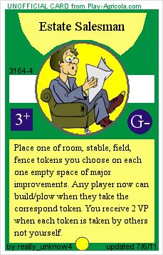 Estate Salesman (occ-3+) Place one of room, stable, field, fence tokens you choose on each one empty space of major improvements. Any player now can build/plow when they take the correspond token. You receive 2 VP when each token is taken by others not yourself. [View playtest games] [View all dealt games] |