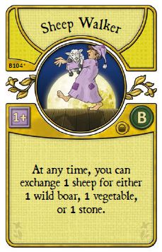Sheep Walker (occ-1+) At any time, you can exchange 1 sheep for either 1 wild boar, 1 vegetable, or 1 stone. [View playtest games] [View all dealt games] |