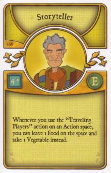 | Storyteller (occ-4+) Whenever you use the "Traveling Players" action on an Action space, you can leave 1 Food on the space and take 1 Vegetable instead. Storyteller (occ-4+) Whenever you use the "Traveling Players" action on an Action space, you can leave 1 Food on the space and take 1 Vegetable instead. [View playtest games] [View all dealt games] |